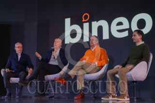 CIUDAD DE MÉXICO, 29ENERO2024.- Fernando Solís Cámara, comunicación social de Banorte; Marcos Ramírez Miguel, Director General de Banorte; Francisco Martha, encargado del Desarrollo Digital de Bineo, y Víctor Moya, director general de Bineo, presentaron Bineo, una banca ciento por ciento digital, según lo señalado por los presentes, la cual tiene una inversión inicial de 110 millones de dólares y piensa captar alrededor de 2.5 millones de usuarios en cinco años. FOTO: MOISÉS PABLO/CUARTOSCURO.COM