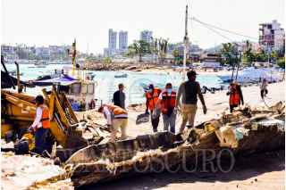 ACAPULCO, GUERRERO. 31ENERO2024.- Luego de tres meses del paso del huracán Otis en el puerto de Acapulco, aún se observan restos de embarcaciones sobre el malecón y en playas, los cuáles ya empiezan a ser retirados por una brigada de trabajadores del Centro de Atención y Proteccion al Turista, para dar una mejor imagen a los visitantes. FOTO: CARLOS CARBAJAL/CUARTOSCURO.COM