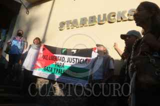 CUERNAVACA, MORELOS, 02FEBRERO2024.- Activistas sociales realizaron una acción en solidaridad con el pueblo palestino fuera de una conocida cafetería trasnacional, a la cual señalaron de ser parte de los corporativos que financian el militarismo de Estado israelí y por lo tanto es cómplice de las más de 30 mil muertes de palestinos a causa de los bombardeos en Gaza. Los activistas regalaron café cosechado en comunidades zapatistas de Chiapas a la vez que repartían volantes con información. FOTO: MARGARITO PÉREZ RETANA/CUARTOSCURO.COM
