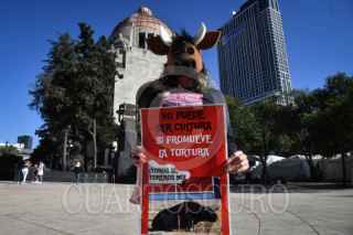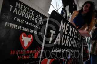 CIUDAD DE MÉXICO, 03FEBRERO2024.- Activistas antitauromaquia a un costado del Monumento a la Revolución buscan reunir 35 mil firmas, con un período hasta septiembre, para ser entregadas a la Suprema Corte de Justicia de la Nación, que busca prohibir definitivamente las corridas de toros. FOTO: MARIO JASSO/CUARTOSCURO.COM