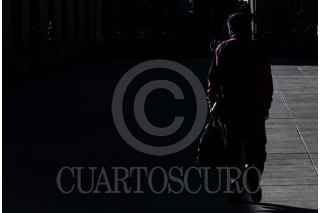 CIUDAD DE MÉXICO, 03FEBRERO2024.- Un hombre camina sobre la línea que divide la luz y sombra sobre la explanada del Monumento a la Revolución. FOTO: MARIO JASSO/CUARTOSCURO.COM