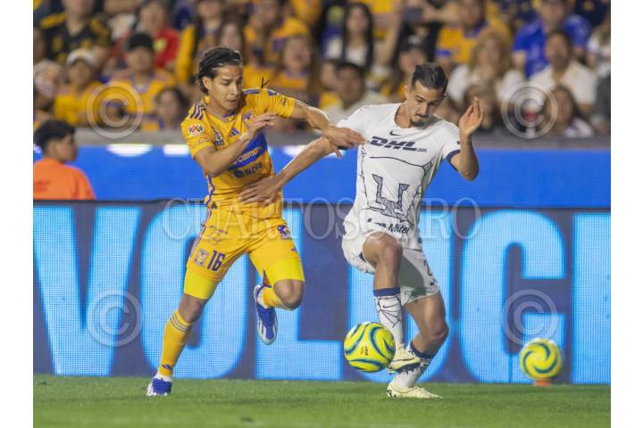 SAN NICOLÁS DE LOS GARZA, NUEVO LEÓN, 03FEBRERO2024.- Diego Lainez de Tigres, se disputa el balón con Pablo Bennevendo de Pumas, en el estadio Universitario, partido correspondiente a la jornada 5 de la Clausura 2024, de la Liga, MX. Marcador Final: Tigres: 2 - Pumas: 2. FOTO: GABRIELA PÉREZ MONTIEL / CUARTOSCURO.COM