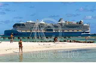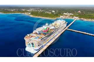 MAHAHUAL, QUINTANA ROO. 06FEBRERO2024. “Al Icon of The Seas” el crucero más grande del mundo. Con más de 10 mil personas a bordo y una longitud de 365 metros, marca un hito en la recuperación del turismo de cruceros en la región. Este barco de la Royal Caribbean se suma a las más de 217 llegadas de cruceros este año. FOTO: ELIZABETH RUIZ/CUARTOSCURO.COM