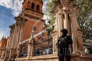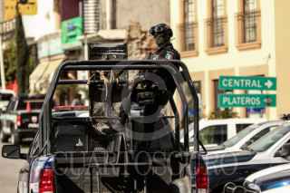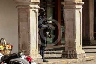 FRESNILLO, ZACATECAS, 08FEBRERO2024.- Seguridad por parte de Policía Estatal en las inmediaciones de la Casa Municipal de Cultura, antes la sede del Ayuntamiento; y la Parroquia de Nuestra Señora de la Purificación, mientras se realiza el homenaje póstumo de Juan Pérez Guardado, quien fuera director de Desarrollo Social del Ayuntamiento y asesinado ayer por la mañana. FOTO: ADOLFO VLADIMIR /CUARTOSCURO.COM