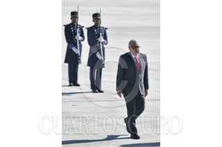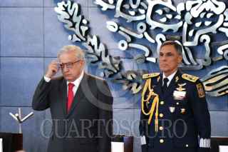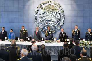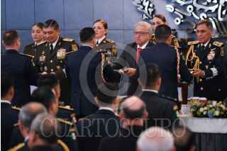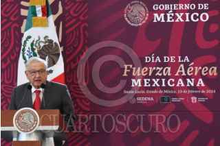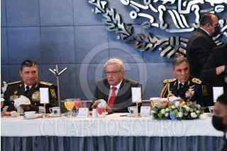 ZUMPANGO, ESTADO DE MÉXICO, 10FEBRERO2024.- Andrés Manuel López Obrador, presidente de México; Luis Cresencio, secretario de la Defensa Nacional, y Bertín Hernández Mercado, Comandante de la Fuerza Aérea Mexicana, se limpian las manos con una toalla húmeda, previo al desayuno conmemorativo por el “109 Aniversario de la Fuerza Aérea Mexicana”, en las instalaciones de la Base Aérea Militar No. 1. FOTO: MARIO JASSO/CUARTOSCURO.COM