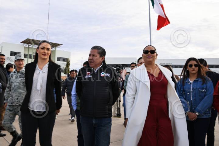 FRESNILLO, ZACATECAS, 10FEBRERO2024.- David Monreal Ávila, gobernador del Estado, dio la bienvenida a 800 elementos del Ejército Mexicano que arribaron este sábado a Zacatecas para fortalecer la estrategia de paz. En su mensaje a las tropas que operarán en el territorio estatal, les dijo que, a pesar de los obstáculos y lo complejo del camino, no se puede permitir dar un solo paso atrás en el proceso de pacificación. El acto se llevó a cabo en el 97 Batallón de Infantería del Ejército Mexicano, de este municipio. En la imagen, Bennelly Hernández, diputada y Rita Rocio Quiñonez, presidenta municipal, acompañan al gobernador del estado. FOTO: ESPECIAL /CUARTOSCURO.COM