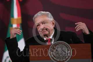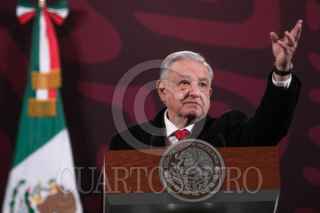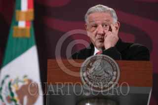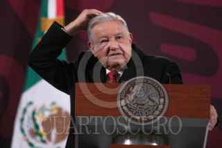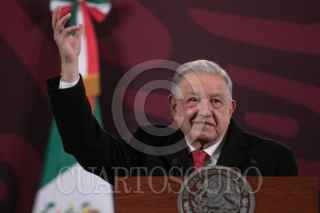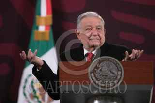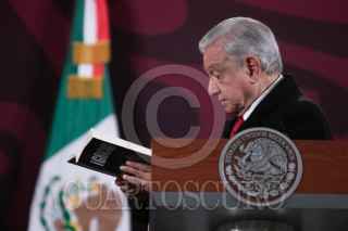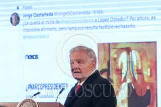 CIUDAD DE MÉXICO, 12FEBRERO2024.- Andrés Manuel López Obrador, Presidente de México, muestra un Twitter de José Castañeda en la cual se muestra la portada de la Revista Nexos que llega la interrogante "Narcopresidente", esto durante la mañanera. FOTO: MOISÉS PABLO/CUARTOSCURO.COM