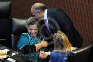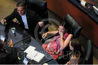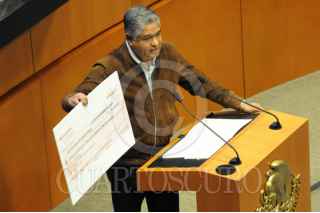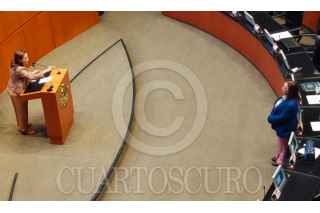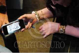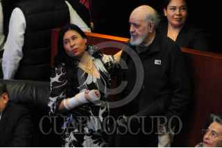 CIUDAD DE MÉXICO, 13FEBRERO2024. - La senadora panista, Kenia López Rabadán, muestra desde un celular el letrero con el hashtag "#NARCOPRESIDENTEAMLO". FOTO: DANIEL AUGUSTO /CUARTOSCURO.COM