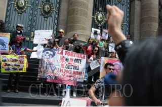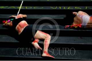 CIUDAD DE MÉXICO, 14FEBRERO2024. - Dos mujeres que aparentan ser dos toros recién asesinados, protesta afuera de la Asamblea Legislativa. FOTO: DANIEL AUGUSTO / CUARTOSCURO.COM