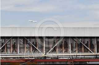 CIUDAD DE MÉXICO, 16FEBRERO2024.- Un avión despega del Aeropuerto Internacional de la Ciudad de México, mientras personas se dirigen a la Cetram Pantitlán a través de un puente peatonal. FOTO: MARIO JASSO/CUARTOSCURO.COM
