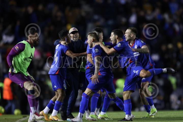 CIUDAD DE MÉXICO, 17FEBRERO2024. Jugadores de Cruz Azul, festejan el tanto que les da la victoria en el partido de fútbol Cruz Azul vs Tigres correspondiente a la jornada 7 del Torneo Clausura 2024 de Liga BBVA MX, en el Estadio Ciudad de los Deportes. FOTO: EDGAR NEGRETE LIRA/CUARTOSCURO.COM