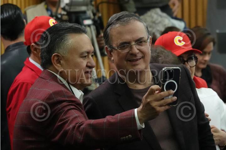 CIUDAD DE MÉXICO, 18FEBRERO2024.- Martín Esparza, líder mexicano del Sindicato Mexicano de Electricistas, y Marcelo Ebrard, se tomaron una selfie durante su llegada al registro como candidata única a la presidencia de Claudia Sheinbaum en las instalaciones del Instituto Nacional Electoral. FOTO: GRACIELA LÓPEZ /CUARTOSCURO.COM
