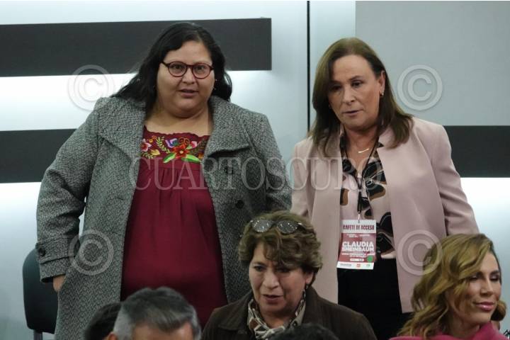 CIUDAD DE MÉXICO, 18FEBRERO2024.- Citlalli Hernández, secretaria General de Morena, Rocío Nahle, secretaria de Energía, y Delfina Gómez , gobernadora del Estado de México, durante su llegada al registro como candidata única a la presidencia de Claudia Sheinbaum en las instalaciones del Instituto Nacional Electoral. FOTO: GRACIELA LÓPEZ /CUARTOSCURO.COM