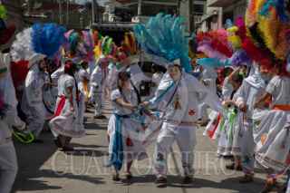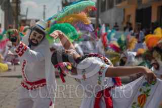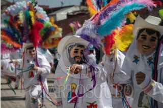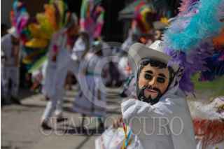 TOTOLAC, TLAXCALA, 18FEBRERO2024.- Portando enormes plumeros de pluma de avestuz y coloridos trajes, se observan a los danzantes de carnaval conocidos localmente como HUEHUES, realizando las evoluciones de sus coreografias durante la celebración del carnaval en esta comnunidad de Totolac. El carnaval posee profundas raíces que mezclan las tradiciones culturales europeas y las indígeneas, tal es el caso de la música que combina sones musicales de los elegantes bailes de salón, con piezas del jarabe tlaxcalteca. Asi mismo, las máscarás son una especie de burla, que los trabajadores indígenas realizaban de los hacendados europeos. FOTO: J.GUADALUPE PÉREZ /CUARTOSCURO.COM