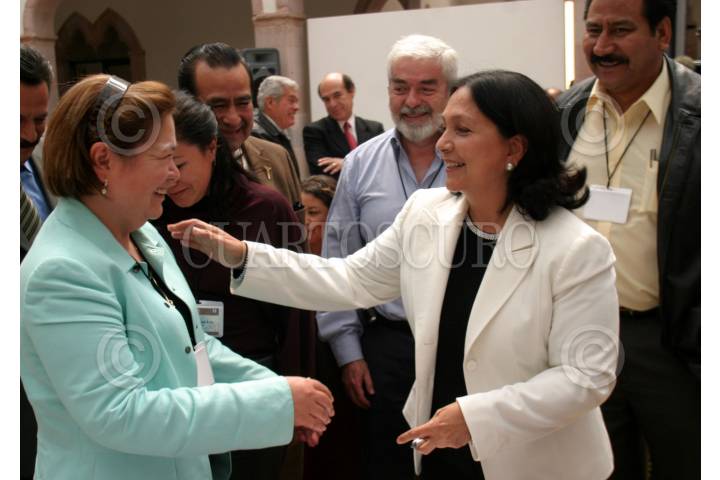 ZACATECAS, ZACATECAS, 22JUNIO2007.- La gobernadora Amalia García Medina, saluda al vicepresidente de CAINTRA Angel Casán Marcos, previo a la inauguración de l foro "Gas Natural y Energías Alternativas para el Desarrollo Económico Sustentable" en el museo de arte abstracto Manuel Felguérez. FOTO: MOISÉS PABLO/CUARTOSCURO.COM