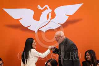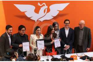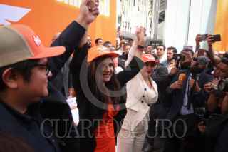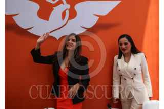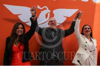 CIUDAD DE MÉXICO, 19FEBRERO2024.- Sandra Cuevas y Dante Delgado, Alejandra Barrales, durante la presentación como candidatas al senado de la República. FOTO: ANDREA MURCIA /CUARTOSCURO.COM