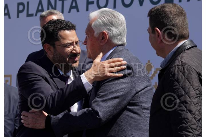 CIUDAD DE MÉXICO, 20FEBRERO2024.- Martí Batres, jefe de Gobierno, y Manuel Bartlett, director General de la Comisión Federal de Electricidad, se despidieron al finalizar su visita a la Planta Solar Voltaica de la Central de Abasto (CEDA). FOTO: GRACIELA LÓPEZ /CUARTOSCURO.COM