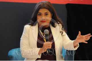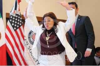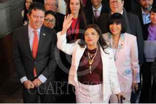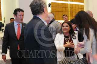 CIUDAD DE MÉXICO, 21FEBRERO2024. - Clara Brugada, candidata de la alianza Sigamos Haciendo Historia, llega a su reunión con la American Society junto a Larry Rubín. FOTO: DANIEL AUGUSTO /CUARTOSCURO.COM