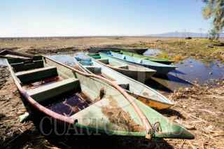 CUITZEO, MICHOACÁN. 21FEBRERO2024. Una de las principales fuentes económicas de la región era la pesca, llegaban a capturar hasta cinco mil toneladas al año de algunos productos, como charal. La parte poniente del embalse se encuentra totalmente sin agua, sólo se observa como si acabaran de regar la tierra salina donde ahora hay pequeños brotes de pasto. La parte oriente, cercana a Cuitzeo, tomando de referencia el puente de acceso a esta población, también ha perdido el agua que superó un metro de altura hasta hace unos cincos años. En el lago sólo queda agua en la parte de los municipios de San Ana Maya, Álvaro Obregón y una pequeña franja de Cuitzeo, en la ribera de la comunidad de San Agustín del Pulque. FOTO: JUAN JOSÉ ESTRADA SERAFÍN /CUARTOSCURO.COM