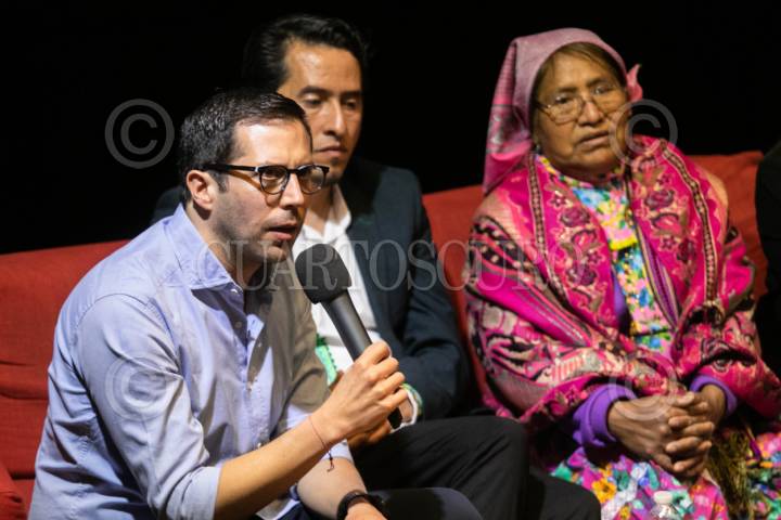 CIUDAD DE MÉXICO, 21FEBRERO2024.- Santiago Esteinou, director de la película, "Mukí Sopalírili Aligué Gawichí Nirúgame. La Mujer de Estrellas y Montañas"; encabezó la presentación de este documental en el Centro Cultural Digital, en el marco del Día Internacional de la Lengua Materna. El filme muestra la historia de Rita, una mujer rarámuri de la Sierra de Chihuahua que fue recluida en un hospital psiquiátrico por 12 años en Kansas, Estados Unidos, en donde fue mal diagnosticada con una enfermedad mental, y tras una batalla legal fue liberada y repatriada a la Sierra de Chihuahua. En la conferencia estuvo presente Juana Osorio, quien es sobrina de Rita, y estuvo al cuidado de ella en sus últimos años de vida. FOTO: MOISÉS PABLO/CUARTOSCURO.COM