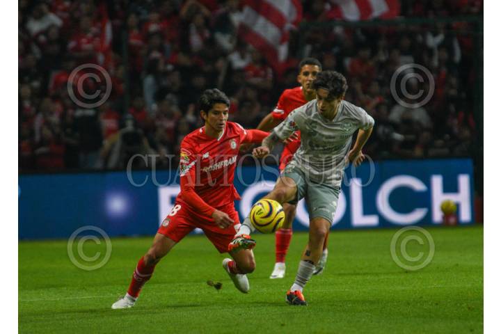 TOLUCA, ESTADO DE MÉXICO, 21FEBRERO2024.- Carlos Orrantia Medio de los Diablos de Toluca y Jordan Carrillo Medio dela escuadra de Santos en la cancha del Nemesio Diez, en el partido correspondiente a la jornada 9 del Torneo Clausura 2024 de la Liga MX, teniendo un marcador final 1-0 a favor de la escuadra escarlata. FOTO: CRISANTA ESPINOSA AGUILAR /CUARTOSCURO.COM