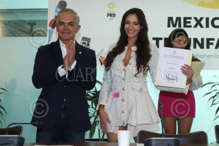 CIUDAD DE MÉXICO, 22FEBRERO2024. El senador Miguel Ángel Mancera hace entrega de un reconocimiento a la actriz Dorismar por parte del grupo parlamentario del PRD a mexicanos triunfadores, en el Senado de la República. FOTO: EDGAR NEGRETE LIRA/CUARTOSCURO.COM