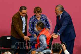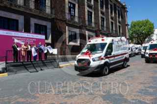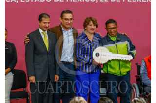 TOLUCA, ESTADO DE MÉXICO, 22FEBRERO2024.- Delfina Gómez Álvarez Gobernadora del Estado de México encabezó la entrega de ambulancias, mastógrafos y apoyos funcionales donados por la Beneficencia Publica del Gobierno Público, acompañada por Adrián Benítez Ruiz, Director General de la Administración del Patrimonio de la Beneficencia Pública, este donativo representa un apoyo a más de 2 mil 900 mexiquenses. FOTO: CRISANTA ESPINOSA AGUILAR /CUARTOSCURO.COM