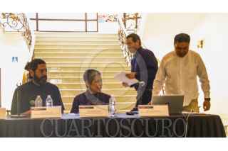 CIUDAD DE MÉXICO. 23FEBREEO2024.- Repositorio de Colecciones del Patrimonio Ferrocarrilero plataforma digital que pone a disposición del público los bienes y documentos históricos del ferrocarril en México, en el vestíbulo de la Casa Miguel Alemán del Complejo Cultural Los Pinos, participaron, Alberto Pacheco, Román Moreno, Teresa Márquez y Bruno Wilson Ebergenyi. FOTO: VICTORIA VALTIERRA/CUARTOSCURO.COM