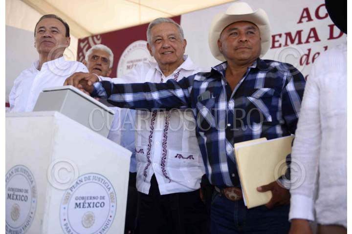 CAJEME, SONORA, 25FEBRERO2024.- Andrés Manuel López Obrador, Presidente de México, encabezó la puesta en operación del Acueducto y Sistema de Agua Potable del Pueblo Yaqui, que se llevó a cabo en el Mirador Escénico de la presa “Álvaro Obregón” o presa del Oviáchic. Lo acompañaron: Alfonso Durazo Montaño, Gobernador Constitucional del Estado de Sonora; Germán Martínez Santoyo, Director General de la Comisión Nacional del Agua. FOTO: PRESIDENCIA/CUARTOSCURO.COM
