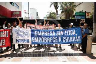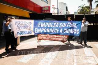 TUXTLA GUTIÉRREZ., CHIAPAS..- 27FEBRERO2024.- Caficultores de Tapachula, exigieron hoy frente al palacio de Gobierno de Chiapas, un mayor precio del kilo de café robusta que compra Nestlé, a través de empresas intermediarias. Este café robusta le sirve a las empresas suiza para hacer el café descafeinado, que vende en frasco, en los centros comerciales de este país, dijeron los campesinos. Agregaron que el costo está a 27 pesos el kilo, pero años anteriores estuvo hasta en 12.50 pesos el kilo del grano, lo cual es muy poco porque cada caficultor tiene que hacer gastos culturales, como la poda, el corte, la siembra y otros trabajos más que generan gastos. FOTO: DAMIÁN SÁNCHEZ/CUARTOSCURO.COM