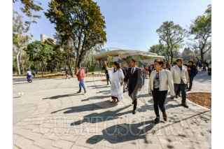 CIUDAD DE MÉXICO, 29FEBRERO2024.- Alejandra Frausto, secretaria de Cultura; Martí Batres, Jefe de Gobierno, y Marina Robles García, secretaria del Medio Ambiente, inauguraron el Jardín Escénico, cuya vocación responde a las nuevas expresiones y necesidades contemporáneas de las artes escénicas e impulsa un diálogo de sustentabilidad con la recuperación de 7 mil metros cuadrados de bosque, que durante muchos años fue utilizado como estacionamiento. Con el apoyo del proyecto Chapultepec, Naturaleza y Cultura, este nuevo espacio une al Complejo Cultural Los Pinos, al Centro Cultural del Bosque y la Segunda Sección. FOTO: SECRETARÍA DE CULTURA/CUARTOSCURO.COM