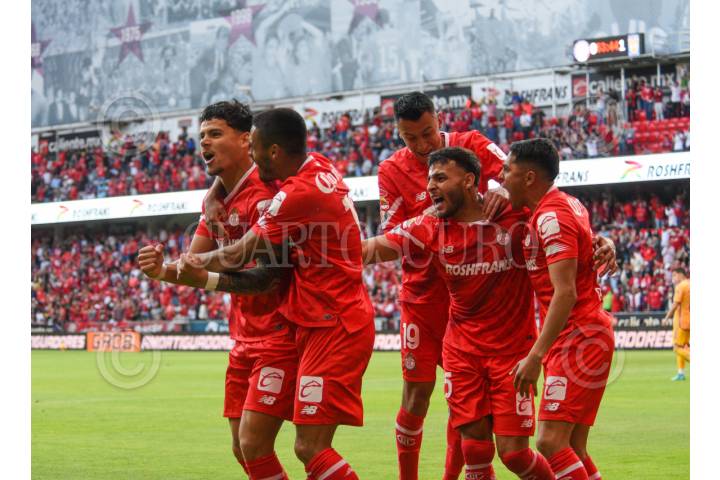 TOLUCA, ESTADO DE MÉXICO, 02MARZO2024.- Jugadores de los Diablos de Toluca festejan su anotación ante la escuadra de Tigres en el partido correspondiente a la jornada 10 del Torneo Clausura 2024, en el estadio Nemesio Diez, con un marcador final 2-1. FOTO: CRISANTA ESPINOSA AGUILAR /CUARTOSCURO.COM