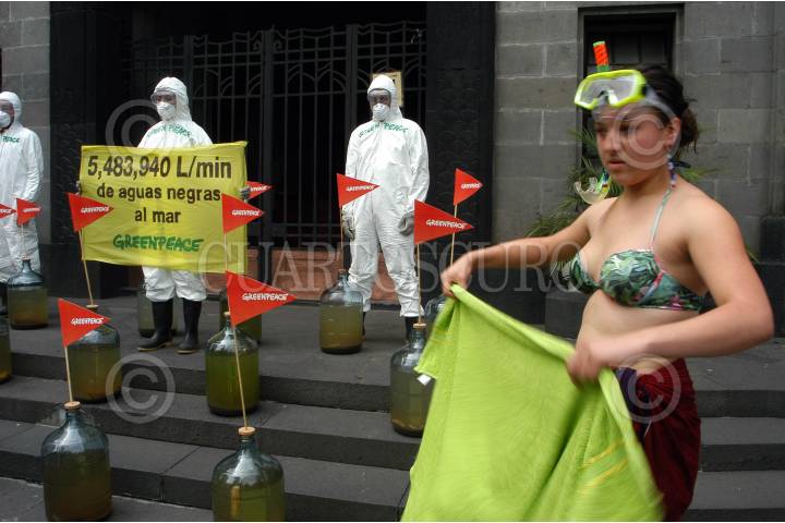 MÉXICO D.F. 28JUNIO2007.- Integrantes de la organización ecologista ¨Greenpeace¨, realizarón una protesta frente a la Secretaría de Salud. Los manifestantes llevaron diversas muestras de agua de mar que tomaron de las playas de Veracruz. Greenpeace denuncia que no existe plantas de tratamiento para las aguas negras en los diversos puntos turísticos. FOTO: GERMÁN ROMERO/CUARTOSCURO.COM