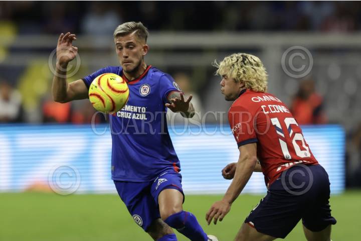 CIUDAD DE MÉXICO, 02MARZO2024. Gonzalo Piovi de la Máquina disputa una pelota a Cade Cowell de las Chivas durante el partido de fútbol Cruz Azul vs Guadalajara correspondiente a la jornada 10 del Torneo Clausura 2024 de Liga BBVA MX, en el Estadio Azteca. FOTO: EDGAR NEGRETE LIRA/CUARTOSCURO.COM