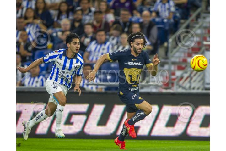GUADALUPE, NUEVO LEÓN, 03MARZO2024.- Sebastián Vegas de los Rayados del Monterrey, se disputa el balón con César Huerta de los Pumas, en el estadio BBVA, partido correspondiente a la jornada 10 de la Clausura 2024. Marcador Final: Monterrey: 3 - Pumas: 0. FOTO: GABRIELA PÉREZ MONTIEL / CUARTOSCURO.COM