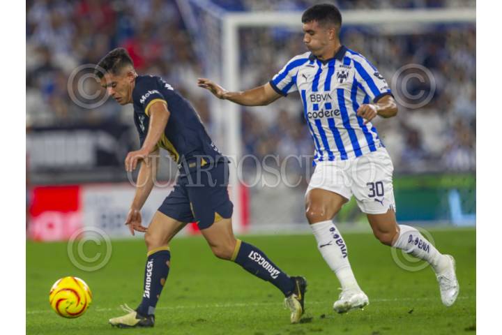 GUADALUPE, NUEVO LEÓN, 03MARZO2024.- Jorge Agustín de los Rayados del Monterrey, se disputa el balón con Piero Aldair de los Pumas, en el estadio BBVA, partido correspondiente a la jornada 10 de la Clausura 2024. Marcador Final: Monterrey: 3 - Pumas: 0. FOTO: GABRIELA PÉREZ MONTIEL / CUARTOSCURO.COM