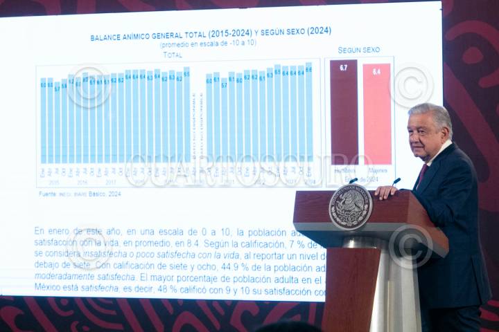 CIUDAD DE MÉXICO, 04MARZO2024.- Andrés Manuel López Obrador, Presidente de México, encabezó su tradicional mañanera en Palacio Nacional, en la cual inauguró su sección de historia, esto ante la veda electoral, ya que el Ejecutivo no puede hablar sobre temas de obras o campañas presidenciales. En la imagen el Ejecutivo muestra una gráfica del INEGI en la que se destaca que México tiene un índice elevado de felicidad. FOTO: MOISÉS PABLO/CUARTOSCURO.COM