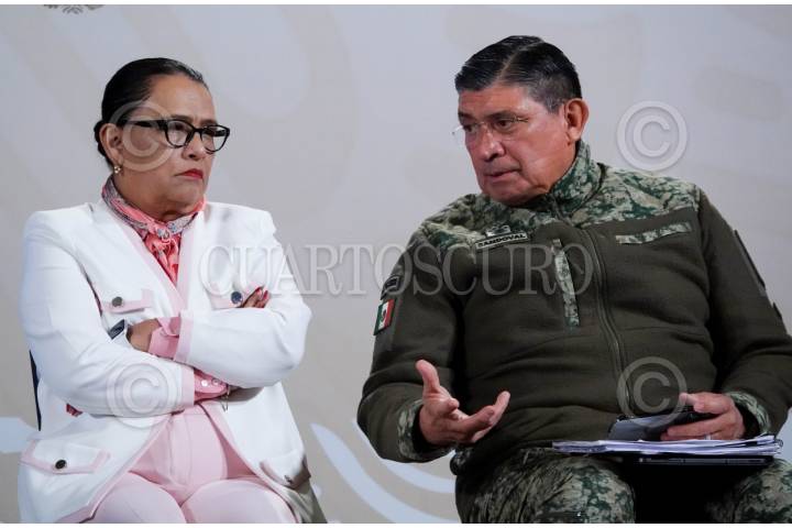 CIUDAD DE MÉXICO, 05MARZO202.- Rosa Icela Rodríguez, secretaria de Seguridad Pública y Protección Ciudadana, conversa con Luis Credencial Sandoval, secretario de la Defensa Nacional, durante la conferencia matutina en qué se presentó el informe de seguridad. FOTO: GALO CAÑAS/CUARTOSCURO.COM