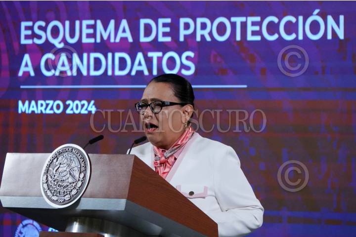 CIUDAD DE MÉXICO, 05MARZO202.- Rosa Icela Rodríguez, secretaria de Seguridad Pública y Protección Ciudadana, presentó el Esquema de Protección a Candidatos en el proceso electoral 2024, durante la conferencia mañanera en qué se realizó el informe de seguridad. FOTO: GALO CAÑAS/CUARTOSCURO.COM