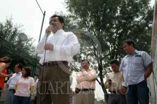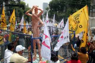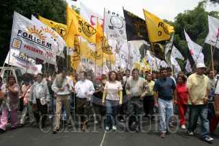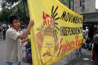 MÉXICO, D.F., 28JUNIO2007.- Miembros del grupo "Los de Abajo" y simpatizantes del PRD colocaron un "monumento al funcionario autista" frente a la Secretaría de Gobernación, en apoyo a la huelga de hambre que realiza el senador Héctor Miguel Bautista López. FOTO: ISAAC ESQUIVEL/CUARTOSCURO.COM
