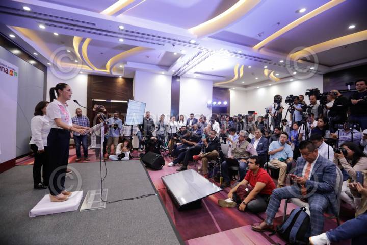 QUERÉTARO, QUERÉTARO, 07MARZO2024.- La candidata Claudia Sheinbaum tuvo una reunión con medios de comunicación. Durante su primera actividad en el estado, la candidata presidencial por la Coalición Sigamos Haciendo Historia, dijo que impulsará que se cuente con gabinetes paritarios, Ley Vicaria, Ley Olimpia, en todos los estados. FOTO: CESAR GÓMEZ/CUARTOSCURO.COM