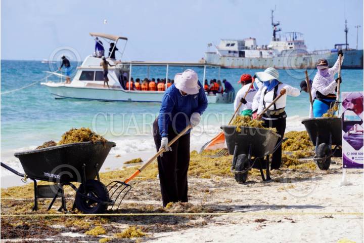 PUERTO MORELOS, QUINTANA ROO, 07MARZO2024.- Según la Universidad del Sur de Florida, habrá un aumento en la abundancia y distribución del sargazo en Quintana Roo en los primeros meses de 2024, pero la extensión a largo plazo de la floración es incierta. Es importante señalar que el sargazo aumenta de abril a mayo. Aunque la llegada del alga es intermitente porque depende de diversas condiciones climáticas, si es moderada, los equipos de limpieza pronto la tendrán bajo control. Científicamente hablando, el sargazo es una macroalga planctónica de color marrón. Hay varias especies, pero la variedad de la que hablamos se caracteriza por tener vesículas llenas de gas que permanecen flotantes. FOTO: ELIZABETH RUIZ/CUARTOSCURO.COM