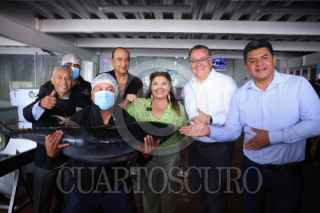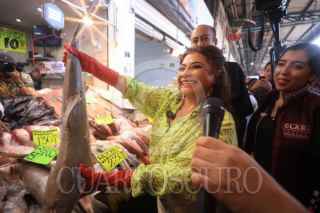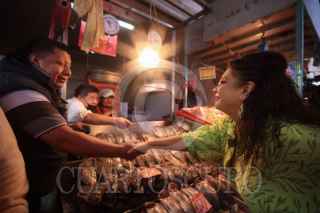 CIUDAD DE MÉXICO, 10MARZO2024.- Clara Brugada, candidata a la Jefatura de Gobierno por la coalición Sigamos Haciendo Historia, recorrió el mercado de venta de pescados y mariscos La Nueva Viga, en la que convivió con los comerciantes.. FOTO: PRENSA CLARA BRUGADA/CUARTOSCURO.COM