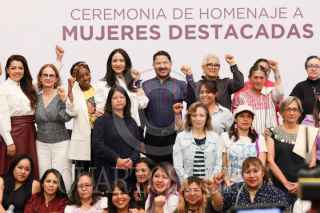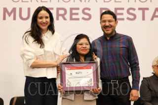 CIUDAD DE MÉXICO, 10MARZO2024.- Claudia Curiel, secretaria de Cultura, y Martí Batres, Jefe de Gobierno, encabezaron la ceremonia en donde se entregaron reconocimientos a "Mujeres Destacadas". Marcelina Bautista Bautista, activista por los derechos de las mujeres trabajadoras del hogar, recibió este reconocimiento. FOTO: PRENSA CIUDAD DE MÉXICO/CUARTOSCURO.COM