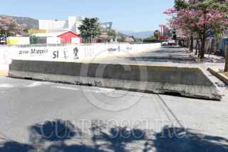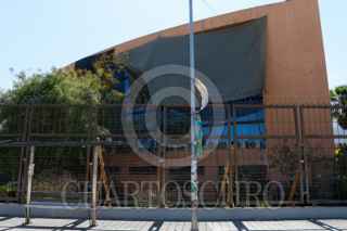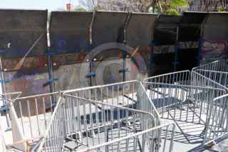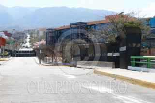 CHILPANCINGO, GUERRERO, 10MARZO2024.- Las instalaciones del Recinto Oficial del Poder Ejecutivo de Guerrero (ROPEG, antes llamado Palacio de Gobierno), se encuentra blindado con vallas metálicas, de concreto y muros de hierro, además de reforzar la barda perimetral con polines de madera y tapar los ventanales del inmueble con lonas, elementos de la Policía Estatal y Guardia Nacional, ante la posibilidad de la irrupción de estudiantes normalistas, quienes advirtieron que continuarán sus protestas por el homicidio de uno de sus compañeros. Desde la noche del sábado fueron colocadas placas altas de metal en el acceso principal, mientras que en los costados y las entradas a los estacionamientos de ese edificio instalaron vayas de metal, un camión materialista y camellones de concreto, además de que retiraron las rejas de las alcantarillas para evitar que se acerquen vehículos. FOTO: DASSAEV TÉLLEZ ADAME/CUARTOSCURO.COM