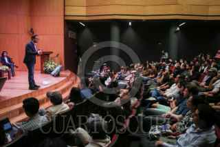 CIUDAD DE MÉXICO, 12MARZO2024.- Mastros y estudiantes recibieron en las instalaciones del ITAM a Salomón Chertorivski, candidato a la jefatura de gobierno de la Ciudad por Movimiento ciudadano. Durante la conferencia habló sobre sus doce propuestas una de la más controversial es reubicar el Aeropuerto Internacional de la Ciudad de México (AICM). FOTO: ANDREA MURCIA /CUARTOSCURO.COM