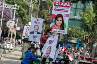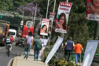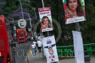 CIUDAD DE MÉXICO, 12MARZO2024.- Inició la guerra por los espacios públicos para que los candidatos a la Jefatura de Gobierno se publiciten hacia la sociedad. En avenida Reforma se han colocado una gran cantidad de pendones publicitarios mostrando la imagen de Clara Brugada (Morena) y Santiago Taboada (PAN). Una brigada de simpatizantes del panista se dedicó a colocar estos cárteles sobre la publicidad de la morenista. FOTO: MOISÉS PABLO/CUARTOSCURO.COM