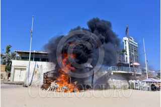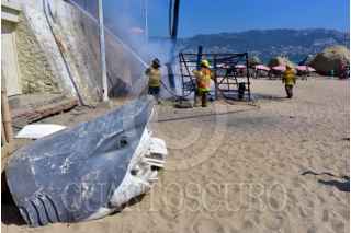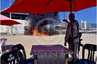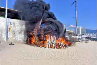 ACAPULCO, GUERRERO, 13MARZO2024.- Mobiliario de playa se incendio esta tarde en la playa El Morro, sillas, mesas, sombrillas y toldos fueron consumidos por el fuego, mientras la Guardia Nacional resguardo mientras ocurria el siniestro, que fue sofocado por bomberos, en los últimos días mobiliario y motos acuáticas, se han incendiado en diferentes playas de Acapulco, sin que la autoridad explique cuales son las causas de los incendios. FOTO: CARLOS ALBERTO CARBAJAL/CUARTOSCURO.COM