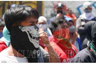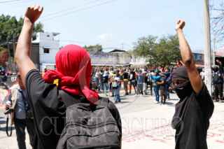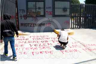 CHILPANCINGO, GUERRERO, 15MARZO2024.- Estudiantes de la normal de Ayotzinapa protestaron en el Congreso local para exigir a los diputados la destitución de la Fiscal de Guerrero, Sandra Luz Valdovinos Salmerón, por el asesinato del estudiante Yanki Kothan Gómez Peralta. Alrededor de 400 jóvenes llegaron a bordo de ocho autobuses a las instalaciones del recinto del Poder Legislativo en dónde realizaron algunas pintas en el suelo y en la fachada, y con un mitin exigieron la destitución de la Fiscal. FOTO: DASSAEV TÉLLEZ ADAME/CUARTOSCURO.COM