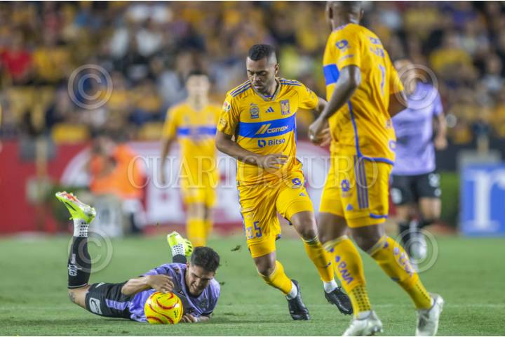 SAN NICOLÁS DE LOS GARZA, NUEVO LEÓN, 16MARZO2024.- Rafael De Souza de Tigres, se disputa el balón con Hugo González de Mazatlán FC, en el estadio Universitario, partido correspondiente a la jornada 12 de la Clausura 2024. Marcador Final: Tigres: 5 - Mazatlán FC: 1. FOTO: GABRIELA PÉREZ MONTIEL / CUARTOSCURO.COM